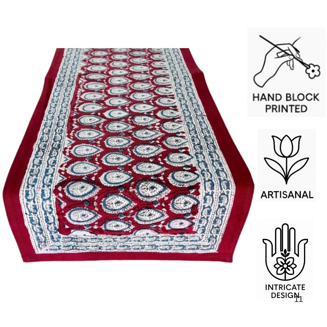 Made from 100% pure cotton canvas, this table cover showcases a timeless paisley-inspired floral jaal motif in madder red, indigo blue, and ivory white tones. The bold red border and patterned edges create a balanced, sophisticated look — blending heritage artistry with modern-day elegance.