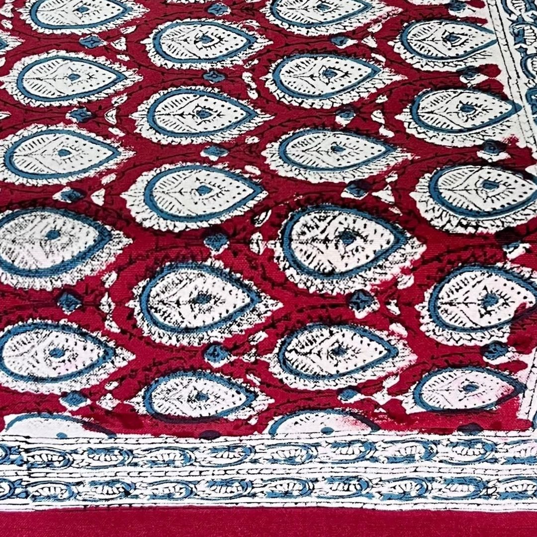 Intricate Artisanal Design Meticulously hand block printed by Jaipur artisans, this design celebrates India’s craft legacy. The combination of rich madder red and indigo hues against a soft ivory base exudes timeless charm, making every piece truly unique.