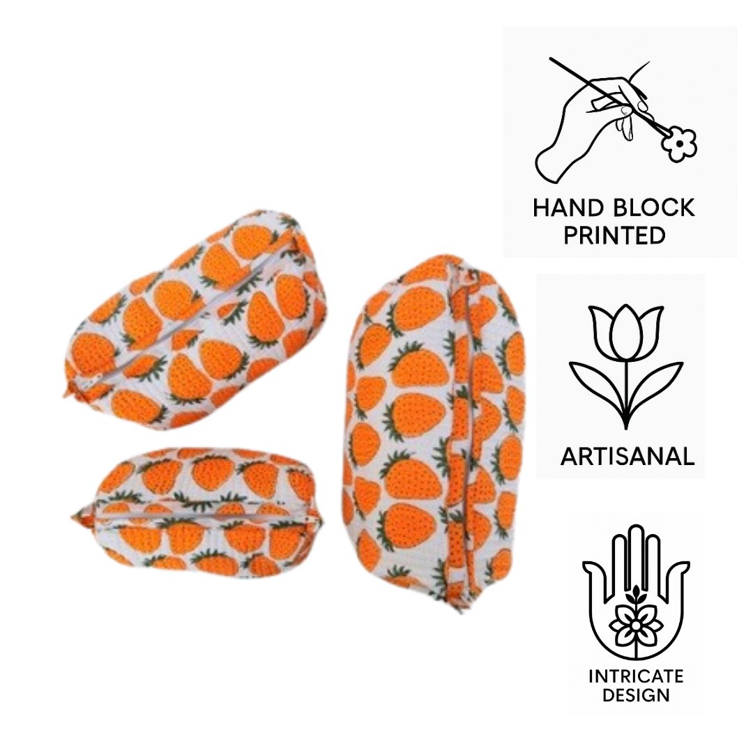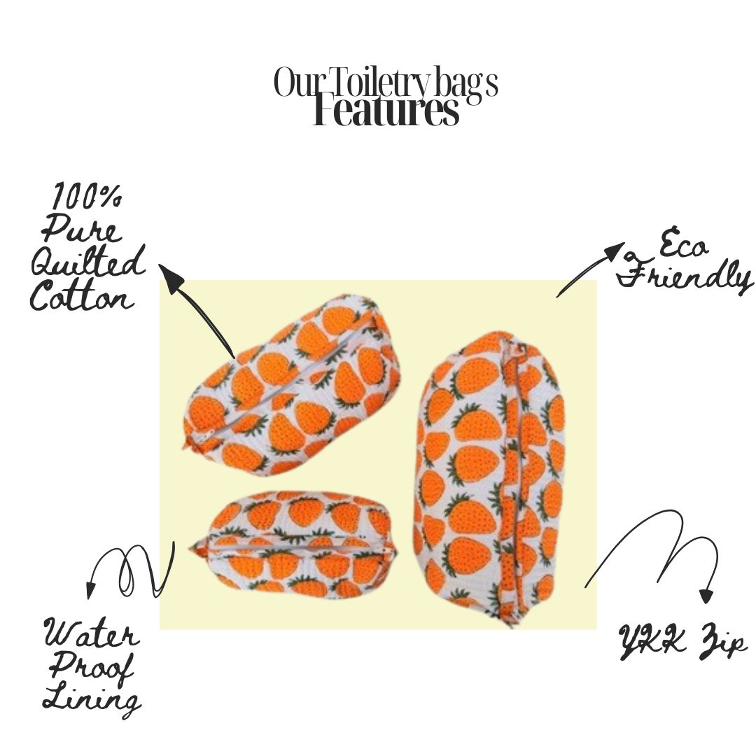 Each bag features a delightful pineapple-inspired print in bright orange and green hues on a crisp white cotton base — a refreshing nod to playful elegance. Made from 100% natural cotton, the bags are quilted for strength, lined with waterproof fabric, and finished with premium YKK zippers for durability and ease of use.
